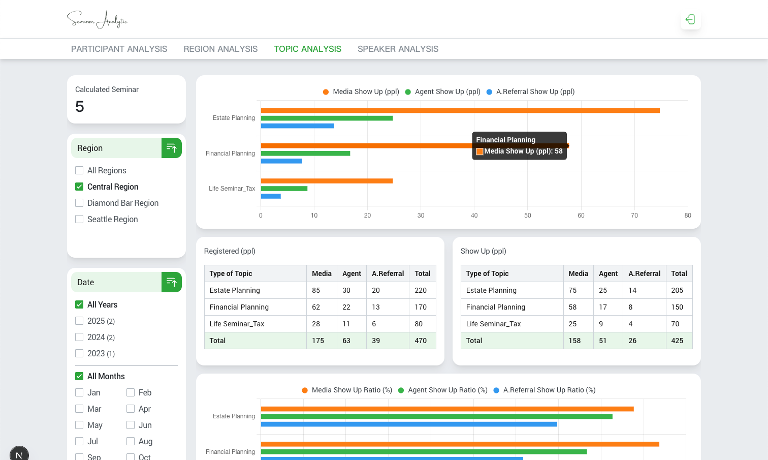 Developed a data-driven seminar analytics dashboard that visualizes attendance performance across regions, topics, and speakers. The system retrieves seminar records from HubSpot via API and displays them through interactive charts and filterable views.